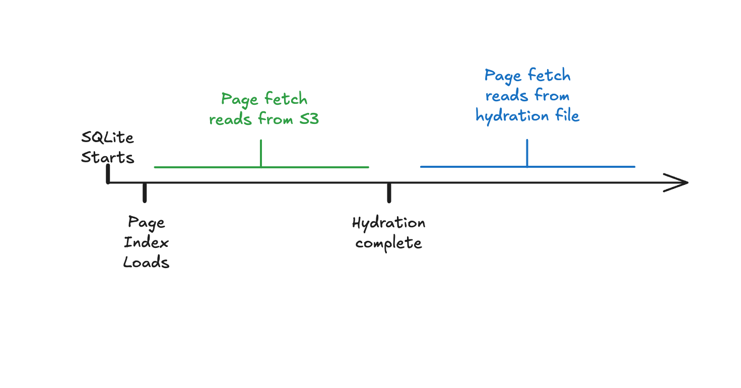 Hydration takes advantage of LTX compaction, writing only the latest versions of each page. Reads don’t block on hydration; we serve them from object storage immediately, and switch over to the hydration file when it’s ready.